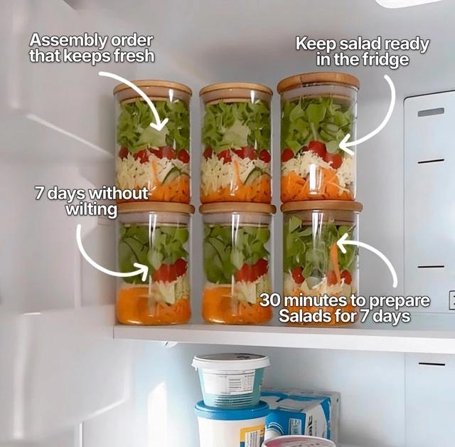 When assembled correctly following the layering method I teach, the salad lasts 5 to 7 days fresh in the refrigerator. This means you prepare everything on Sunday and have healthy lunch or dinner ready all week. Zero waste, zero daily work.